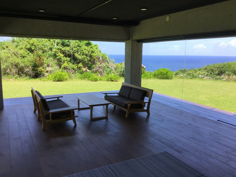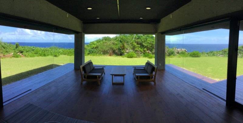 3面が枠無し床からのFIXガラス、周囲はウッドデッキです。