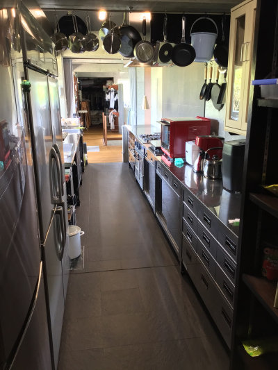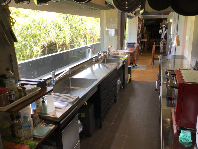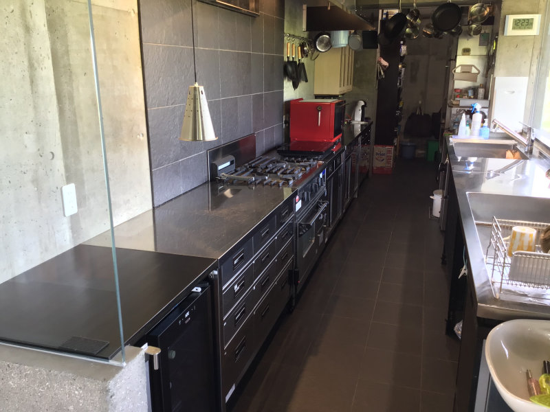 本格的業務用厨房です。シンクは特注、奥は食品庫です。