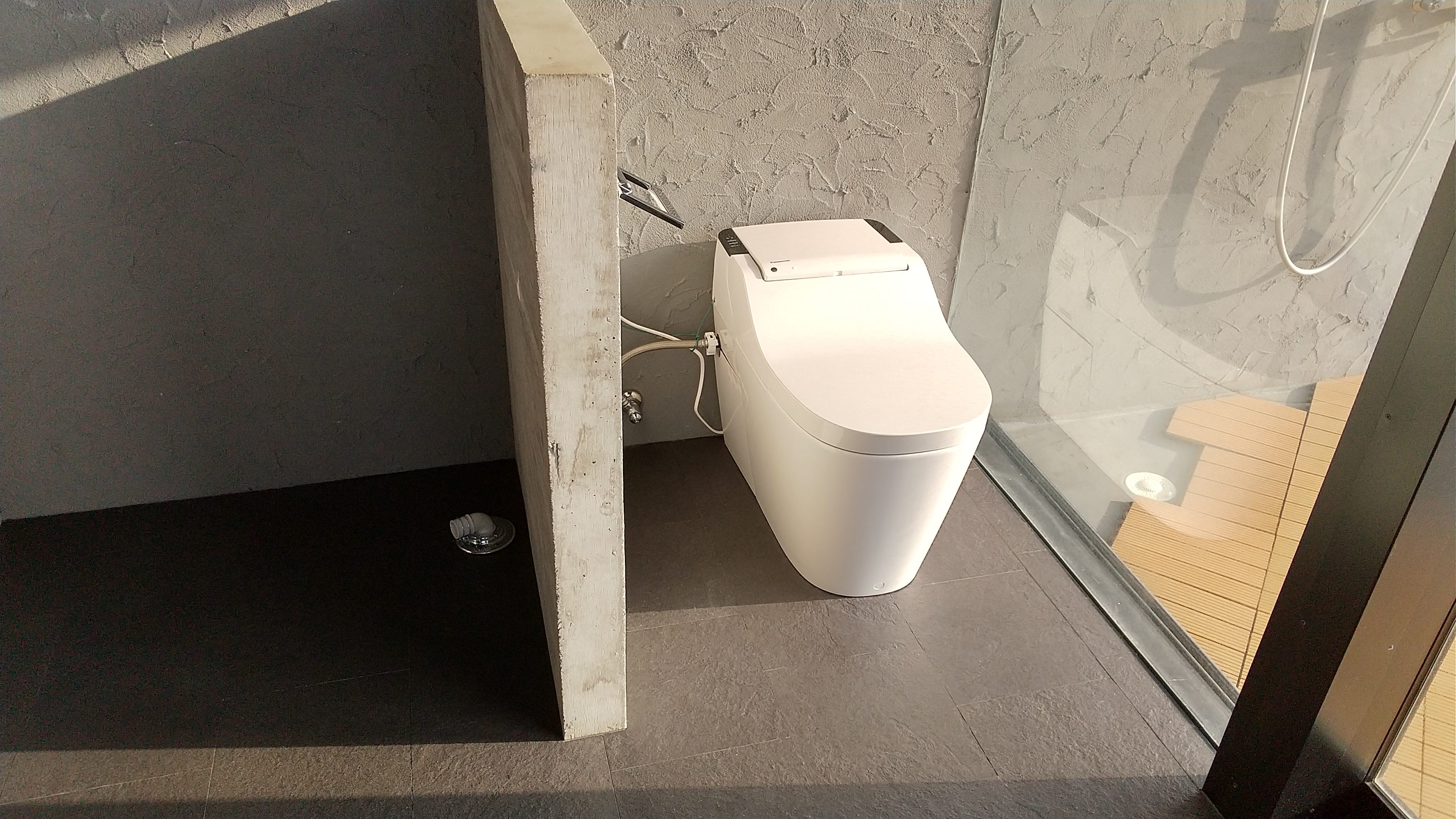 サニタリーエリアもガラス張り。奥のバルコニーには、露天シャワーもあります。